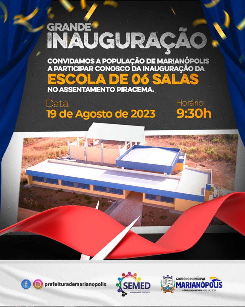 A prefeitura de Marianópolis do Tocantins, vai inaugurar no próximo sábado, 19 de agosto de 2023, a Escola Municipal do P.A. Piracema, às 9 horas e 30 minutos.