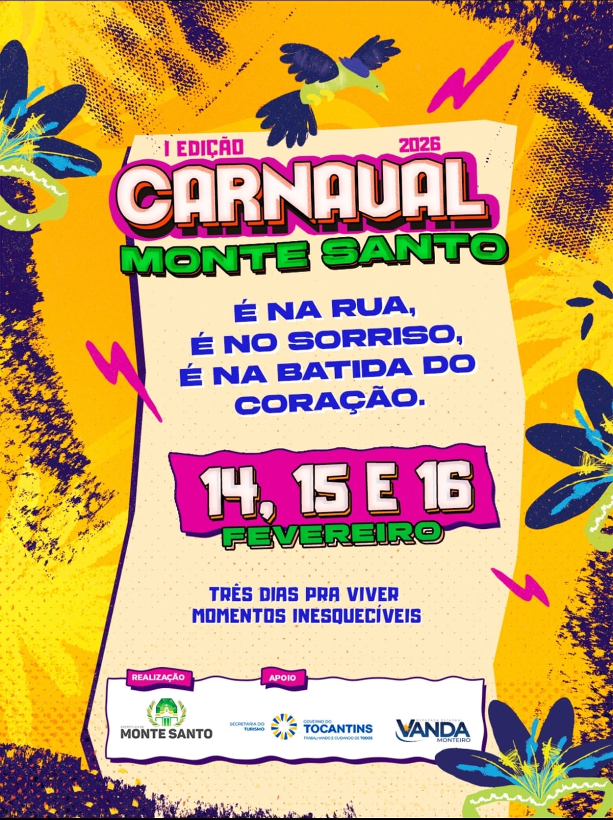 O Carnaval de Monte Santo 2026 contará com o apoio do Governo do Estado do Tocantins e da deputada estadual Vanda Monteiro (PL), fortalecendo a estrutura do evento e garantindo uma programação diversificada para os três dias de festa.