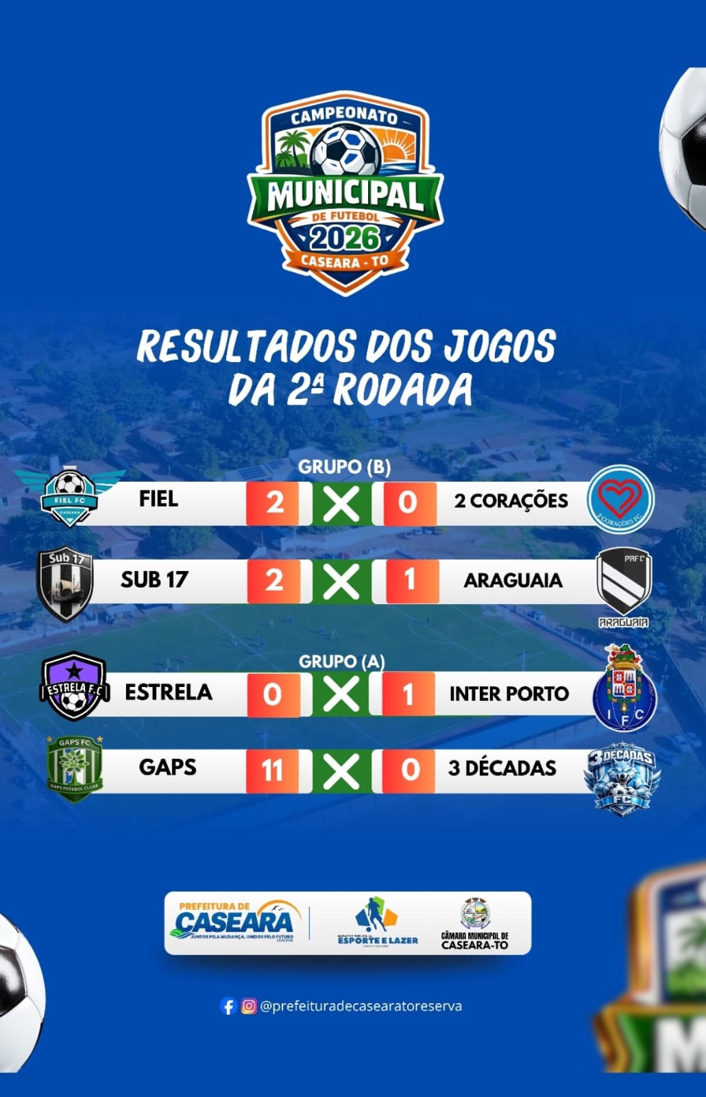 O Campeonato Municipal de Futebol de 2026, realizado em Caseara, segue movimentando o cenário esportivo local e atraindo grande público ao Estádio Luiz Pereira. No último fim de semana de março, a Secretaria Municipal de Esporte divulgou os resultados da segunda rodada da competição, marcada por jogos disputados e goleadas expressivas.
