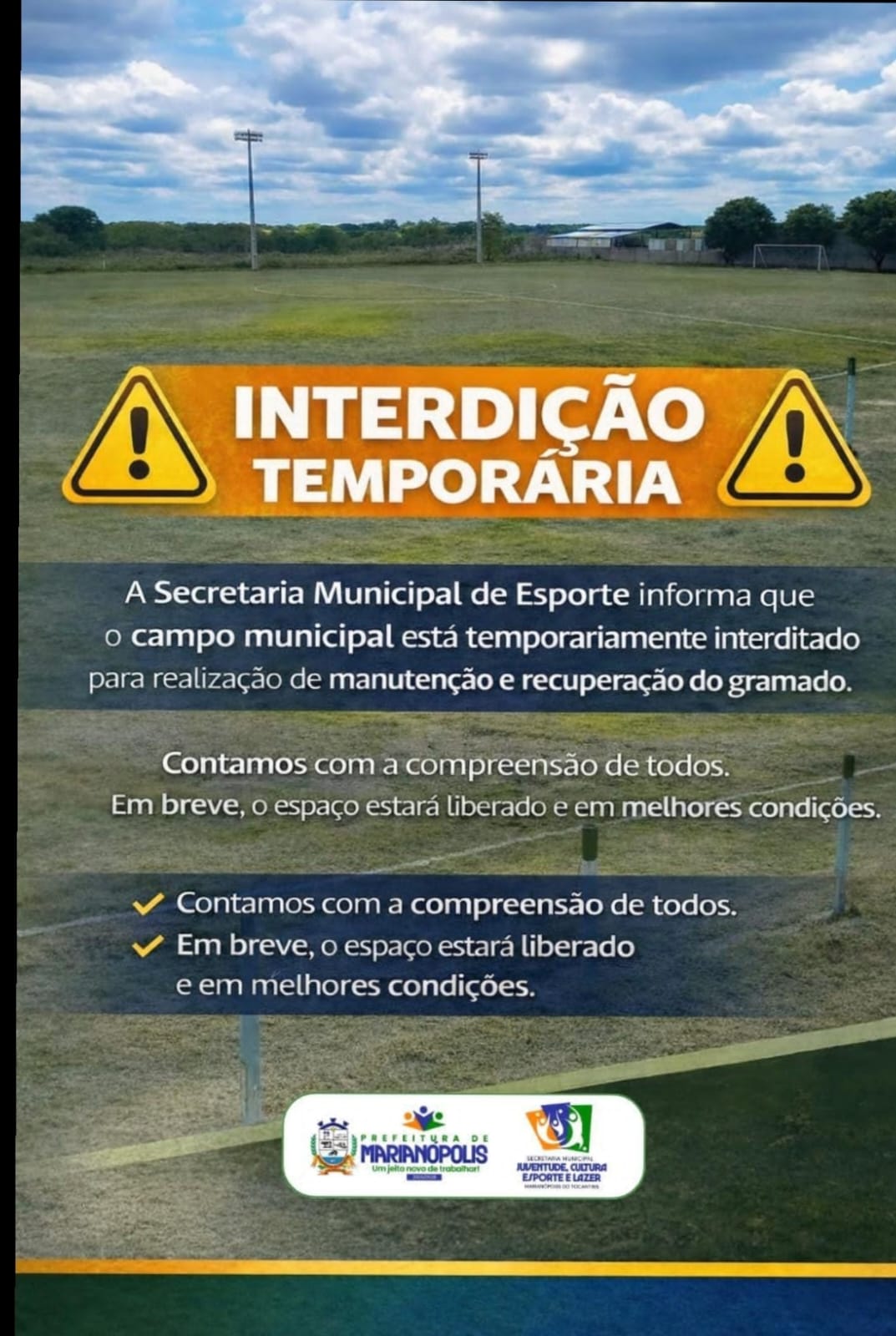 A Secretaria Municipal de Esporte de Marianópolis do Tocantins anunciou, neste domingo, 1º de fevereiro de 2026, a interdição temporária do Estádio Municipal Carneirão para a realização de serviços de manutenção e revitalização do gramado. De acordo com a pasta, o campo passará por um processo de melhorias na grama esmeralda, que inclui a aplicação de terra vegetal, sais minerais e outros insumos de adubação.