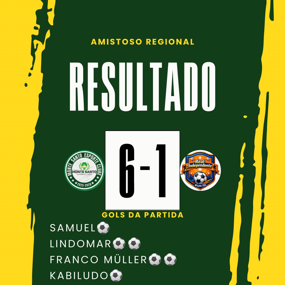 A equipe do Monte Santo Esporte Clube venceu com autoridade o Real Independente de Pium pelo placar de 6 a 1, em amistoso regional disputado na noite deste sábado 28 de 2026, no estádio de Benição, em Monte Santo do Tocantins.