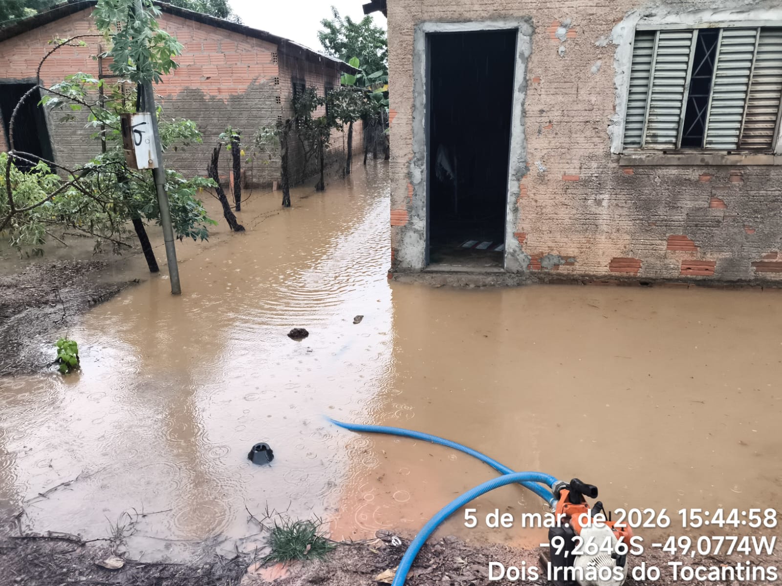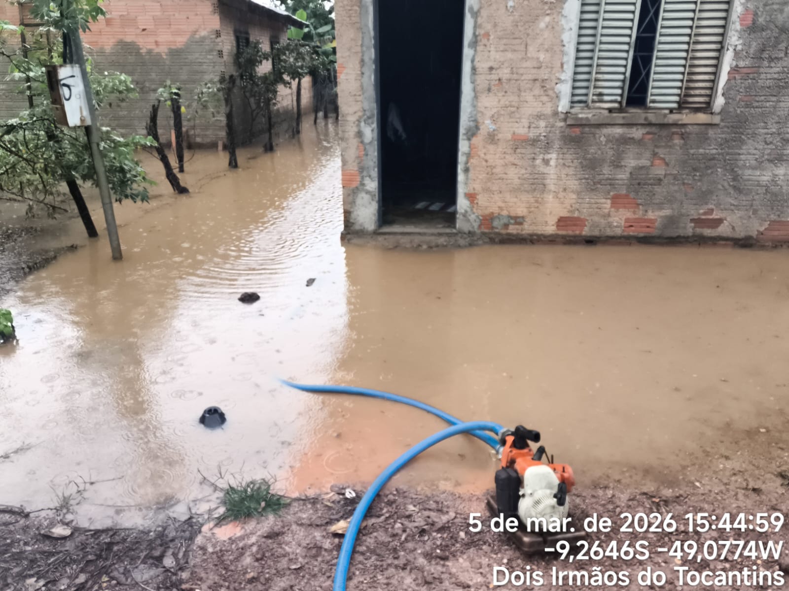 A equipe da Defesa Civil de Dois Irmãos do Tocantins realizou, na tarde de quinta-feira 5 de março de 2026, uma operação para retirada de água de duas residências atingidas por alagamentos após a forte chuva que caiu na cidade. A ação teve como objetivo minimizar os danos provocados pelo temporal e garantir a segurança e a saúde das famílias afetadas.