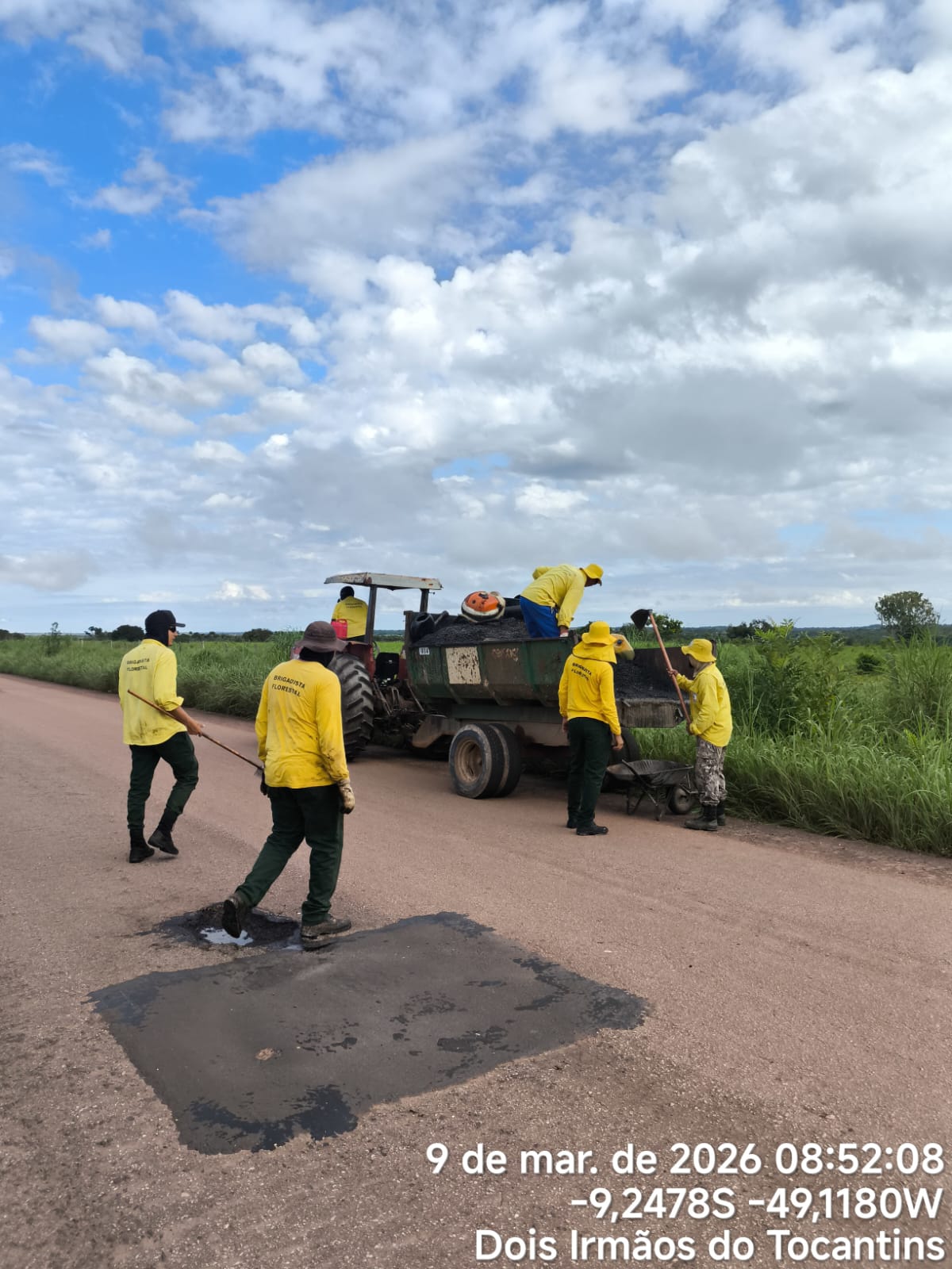A Defesa Civil e a Brigada Ambiental de Dois Irmãos do Tocantins, em conjunto com a Secretaria Municipal de Infraestrutura e Obras, deram sequência nesta terça-feira 10 de março de 2026 à Operação Tapa-Buracos no trecho da rodovia TO-348 que liga o município a Araguacema.