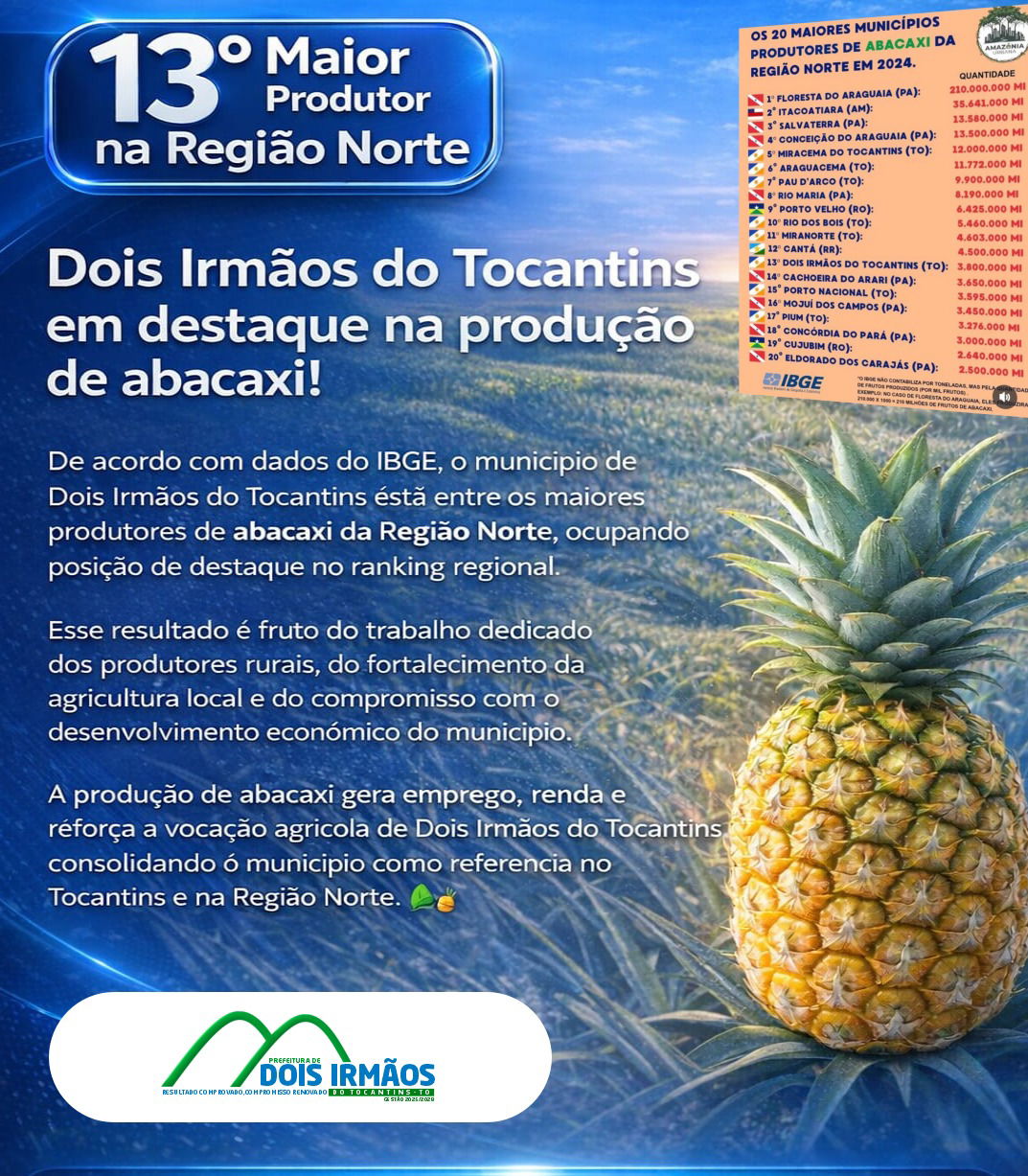 O município de Dois Irmãos do Tocantins vem se consolidando como referência na fruticultura regional. De acordo com dados do Instituto Brasileiro de Geografia e Estatística (IBGE), o município ocupa a 13ª posição entre os maiores produtores de abacaxi da Região Norte do Brasil, um resultado que evidencia a força da agricultura local e o protagonismo dos produtores rurais.