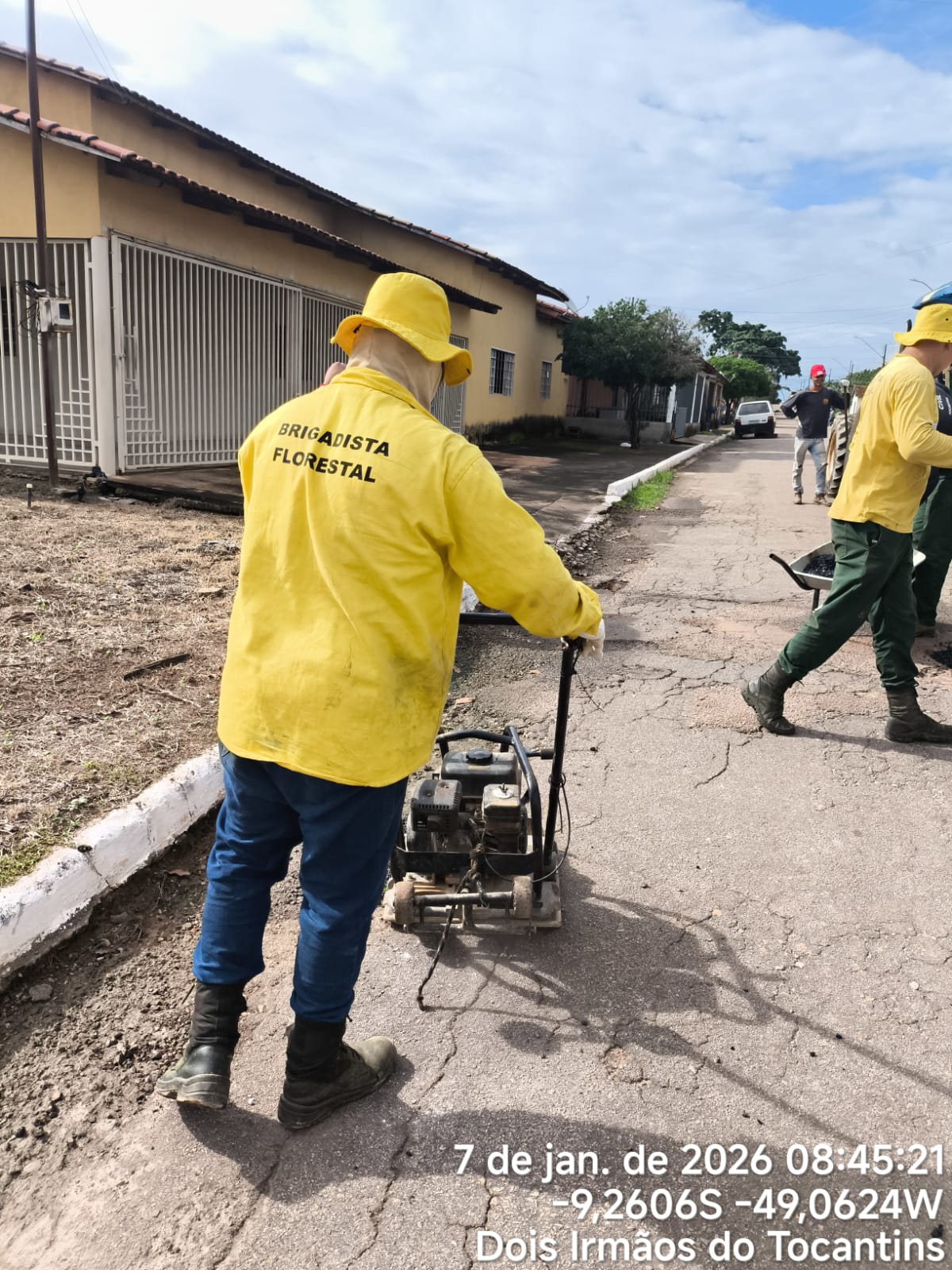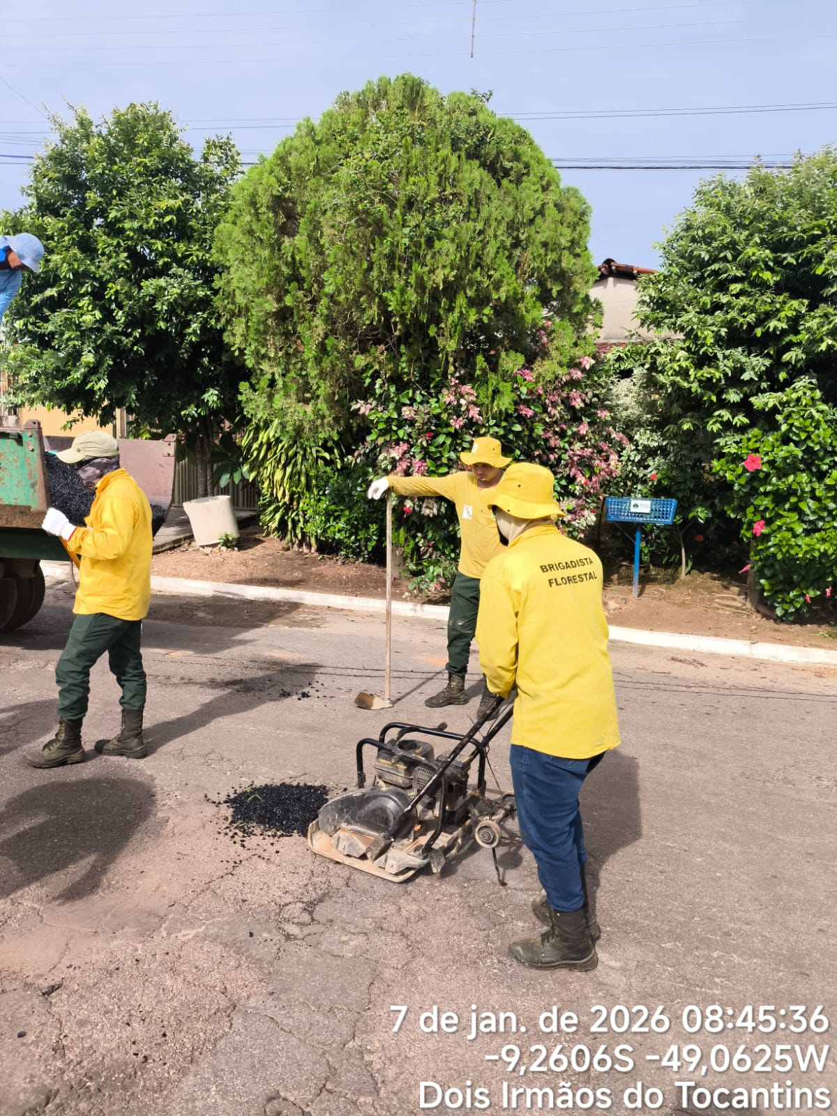 A Prefeitura de Dois Irmãos do Tocantins segue intensificando os trabalhos de recuperação da malha viária do município por meio da Operação Tapa-Buraco, executada pela Secretaria Municipal de Infraestrutura, com apoio direto da Brigada Ambiental, coordenada pelo servidor Rogério Medrado. De acordo com a gestão municipal, os serviços tiveram início pela Avenida Antônio Delfino, uma das principais vias da cidade, e devem avançar gradativamente para outras ruas e avenidas, conforme o cronograma estabelecido pela Secretaria de Infraestrutura.