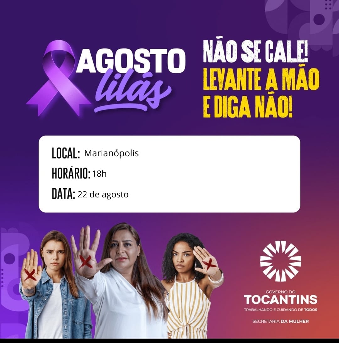 No dia 22 de agosto de 2024, a Secretaria Municipal de Assistência Social, em parceria com o Centro de Referência Especializado de Assistência Social (Creas) e diversos colaboradores, promoveu um evento significativo em Marianópolis do Tocantins, em alusão à campanha Agosto Lilás. Com o tema "Não se cale. Levante a mão, diga não".