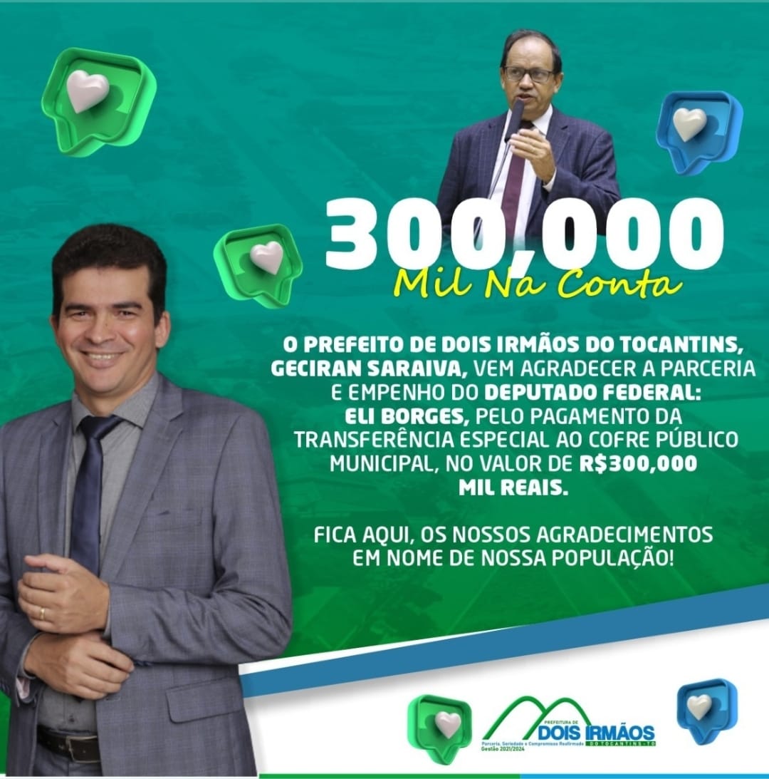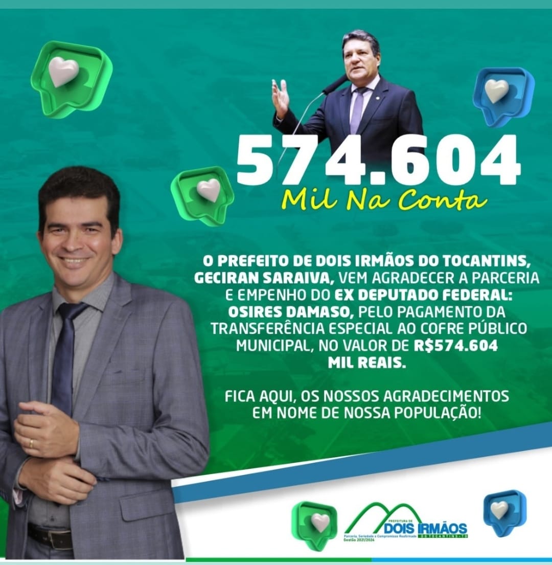 A prefeitura de Dois Irmãos do Tocantins, recebeu nesta semana, recursos de transferência especial do deputado federal Eli Borges (PL-TO) e do ex-deputado federal Osires Damaso (PSC-TO). Borges viabilizou 300 mil reais, já a emenda de Damaso, o montante chega a 574 mil reais.