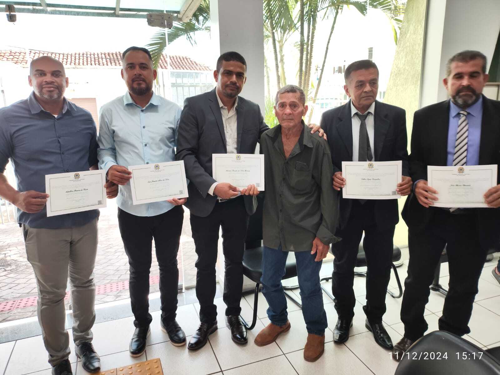 Seu Manel posa para fotos com o filho e os demais vereadores diplomados - Foto: Edsom Gilmar