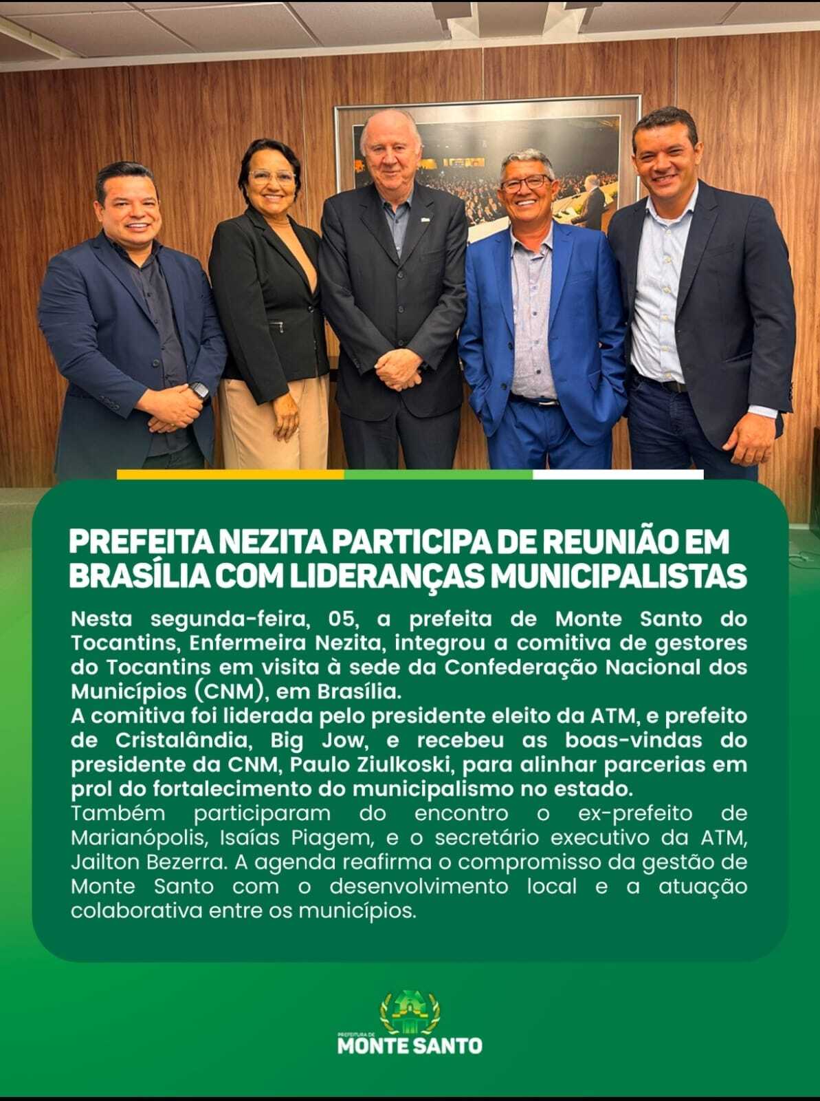 A prefeita de Monte Santo do Tocantins, Enfermeira Nezita (UB), participou a manhã desta segunda-feira, 5 de maio de 2025 de uma reunião na sede da Confederação Nacional dos Municípios (CNM), em Brasília (DF).