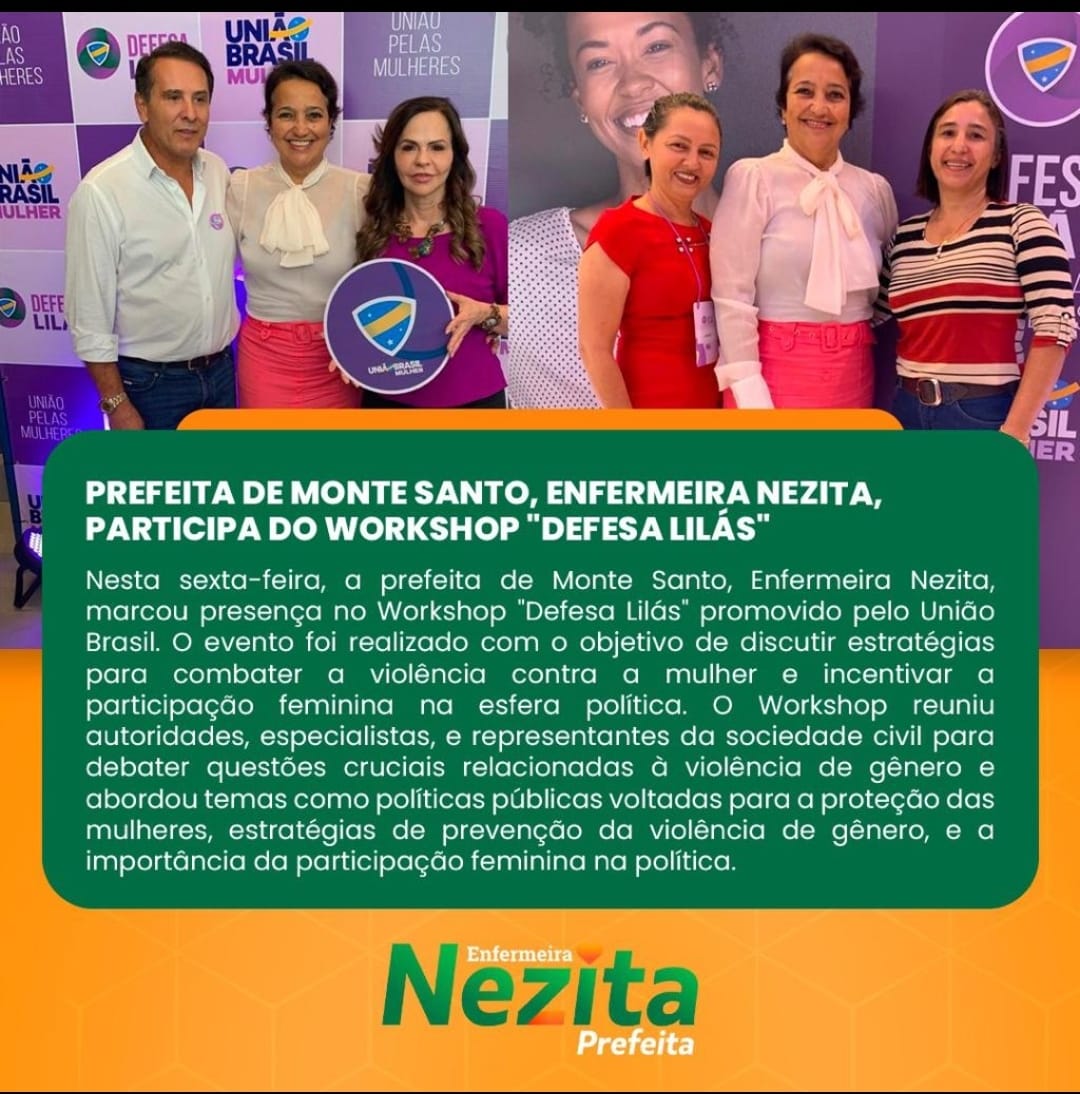 A prefeita de Monte Santo de Tocantins Enfermeira Nesita União Brasil (UB), participou do workshop em "Defesa Lilás", promovido pela união Brasil sobre a coordenação da senadora professora Dorinha Seabra (UB-TO).
