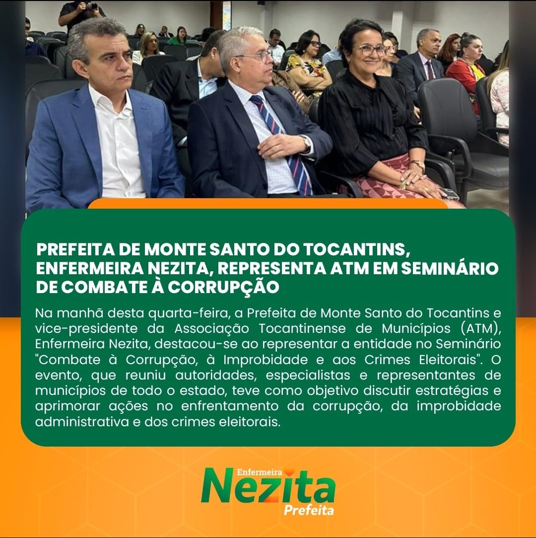 A prefeita de Monte Santo do Tocantins e Vice-presidente da a associação Tocantinense de municípios (ATM) Enfermeira Nezita Martins (UB), participou nesta quarta-feira, 06 de novembro de 2023, do evento promovido pela Escola de Superior Magistratura do Tribunal de Justiça do Tocantins (TJ-TO ), intitulado "Seminário de Combate à Corrupção".