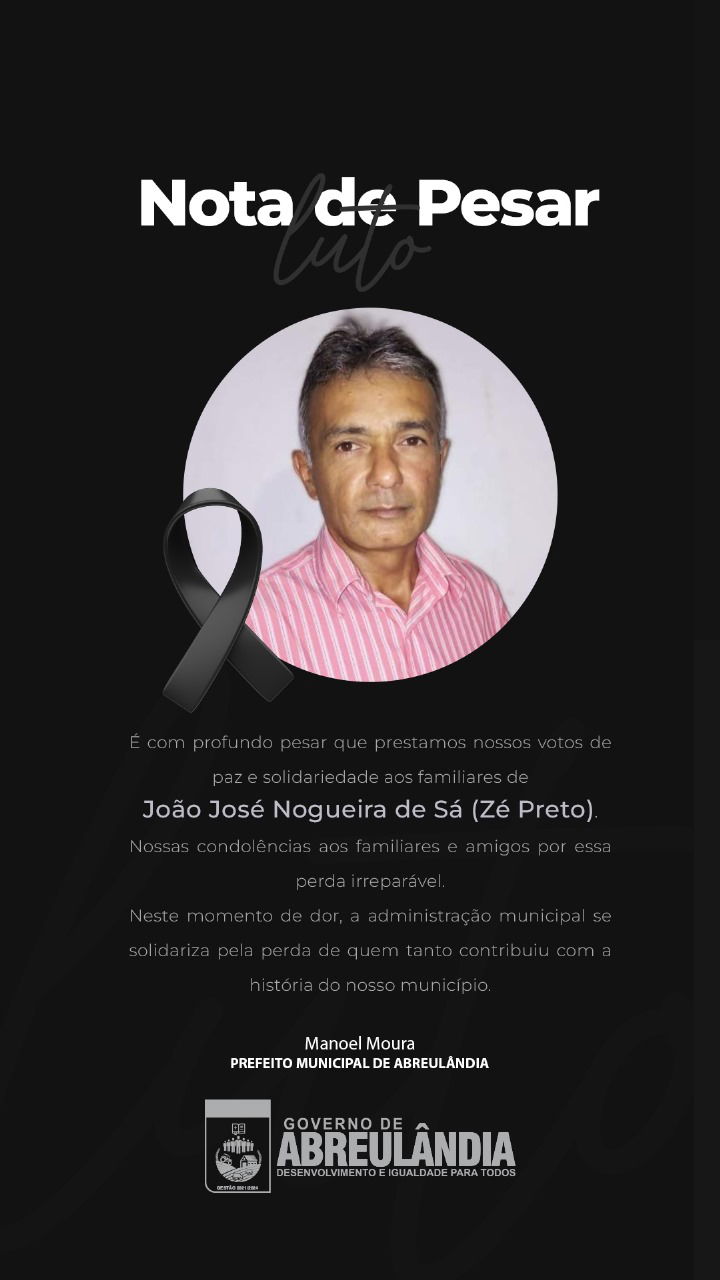 “A Prefeitura de Abreulândia lamenta profundamente o falecimento de João José Nogueira de Sá, conhecido como Zé Preto. Zé Preto foi ex-vereador da cidade de Abreulândia e um grande líder político dentro do município, além de ser um dedicado agricultor. Seu falecimento ocorreu no dia 27 de janeiro de 2024. Neste momento de dor, a Prefeitura de Abreulândia expressa suas condolências em nome do prefeito Manoel Moura. Que a família e amigos encontrem conforto e paz neste momento difícil”.