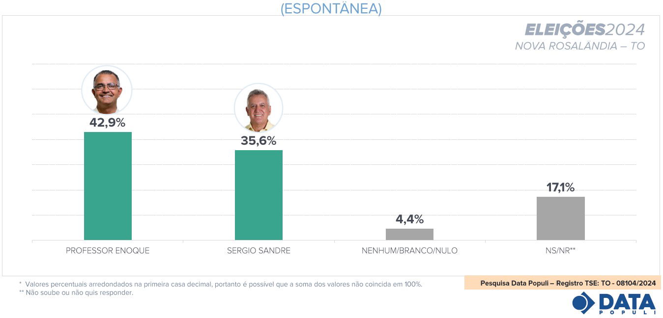 Nova pesquisa eleitoral realizada pela Data Populi em Nova Rosalândia (TO) aponta o Professor Enoque como favorito na corrida pela prefeitura nas eleições de 2024. O levantamento, registrado no TSE sob o número TO-08104/2024, foi realizada no dia 10 de setembro de 2024, com 340 entrevistas presenciais.
