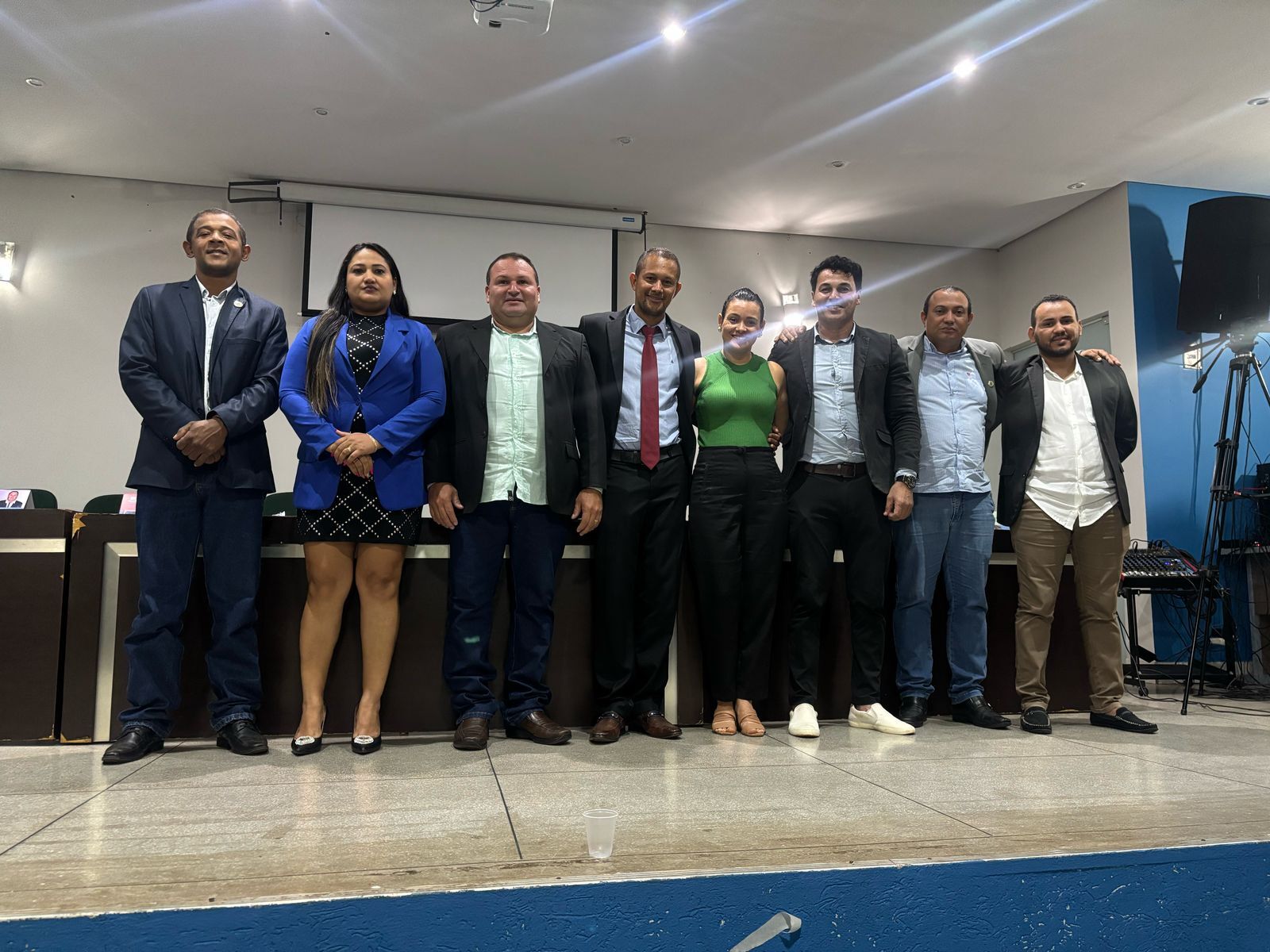 Prof. Valdivan (PT), Jorge Dias (UNIÃO), Igor Baracho (MDB), Paula Gil (UNIÃO), Arnor Aires (PDT), Professor Ozias (MDB) e a vice-prefeita e secretária municipal de Saúde, Leía Mota (PV).