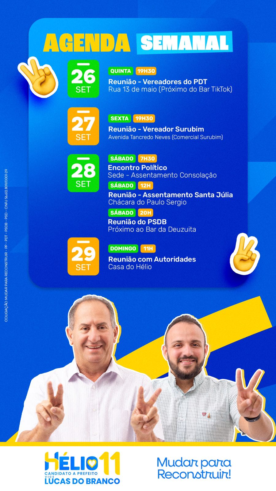 A coordenadoria da campanha de Hélio Silvestre Teixeira (PP), candidato à Prefeitura de Divinópolis do Tocantins, divulgou a agenda da reta final da campanha para os próximos dias. Com uma série de encontros e reuniões, a estratégia visa mobilizar o eleitorado e consolidar o apoio à candidatura, que conta com o empresário e ex-vereador Lucas do Branco (PP) como vice.
