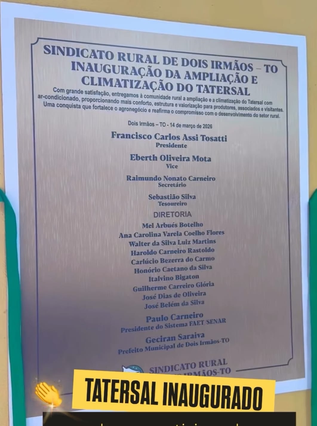 O prefeito de Dois Irmãos do Tocantins, Irmão Geciran Saraiva (UB), participou neste sábado 14 de março de 2026 da inauguração da ampliação e modernização do Tatersal do Sindicato Rural de Dois Irmãos do Tocantins. A reforma visa melhorar as condições de trabalho para os produtores rurais e simpatizantes que frequentam os leilões de gado bovino no local.